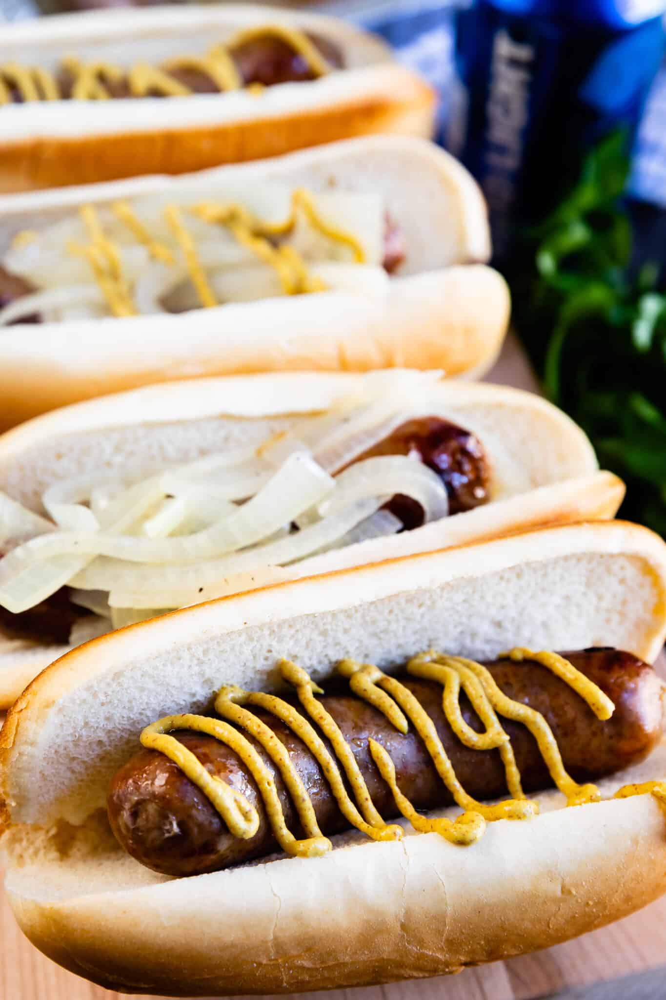 - Serve them in buns with the onions and any other toppings that you like! Sometimes we keep it a little lower-carb and skip the buns and serve them as is with just the onions and some mustard on the side.