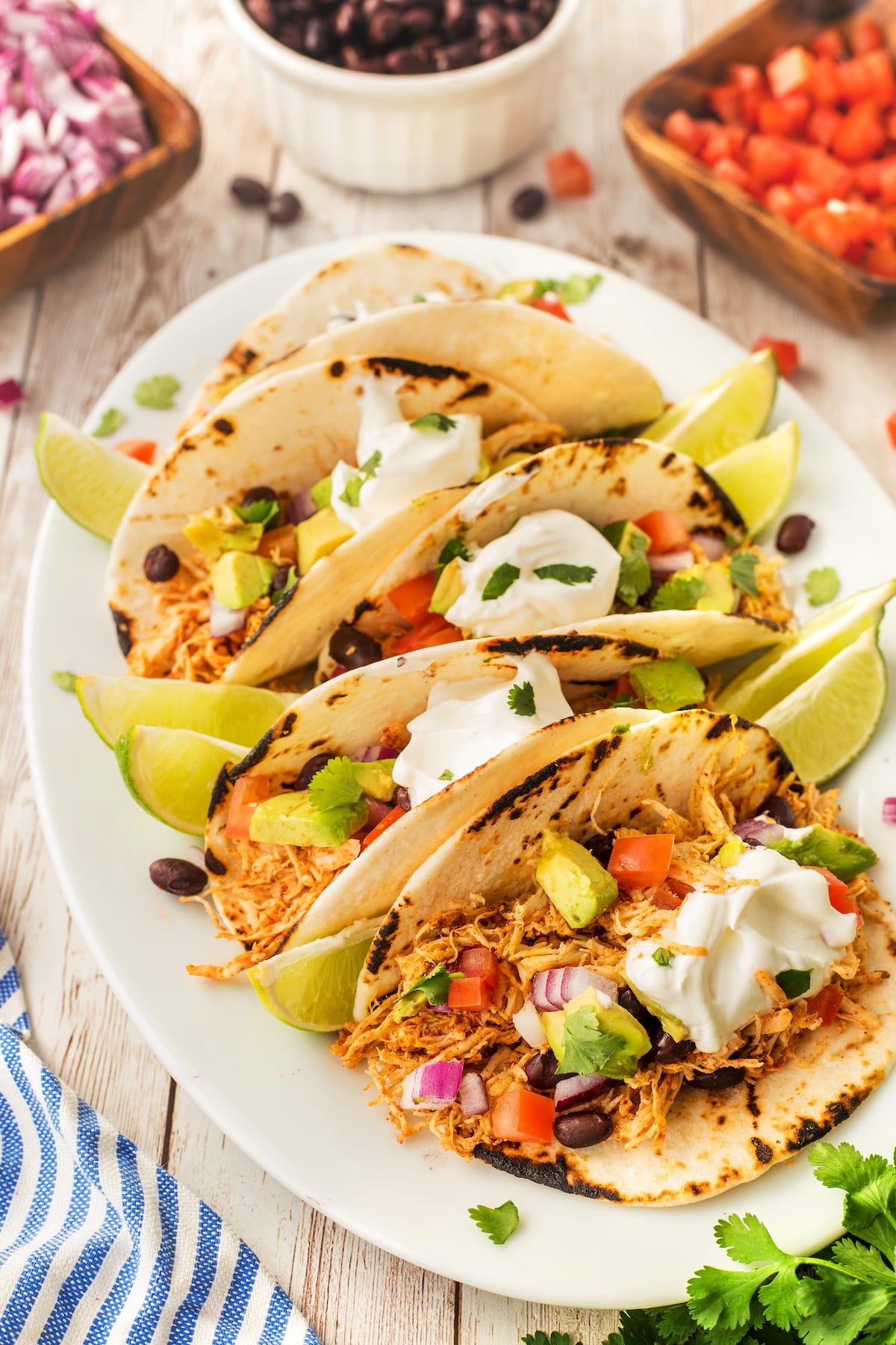 - Place the shredded chicken in warm corn tortillas and top it with the onion, tomatoes, black beans, and avocado. Add some sour cream and cilantro as a garnish. For serving, I like to cut up lime wedges and add a squeeze of lime juice – this adds so much flavor.